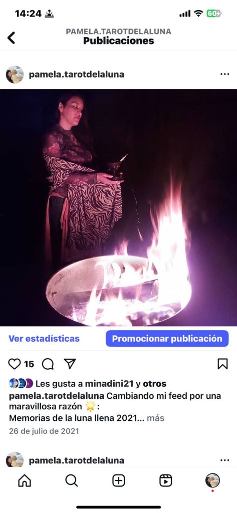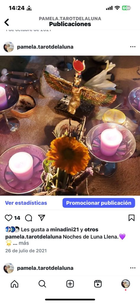 - Julio 2021. Noche mágica de Luna Llena con una querida amiga mía. Omito su nombre por respeto a su privacidad y el hecho de que no le pedí permiso para publicar su nombre pero si alguna vez ella lee esto, sabrá perfectamente que es ella de quien hablo. Aquella vez me invitó a una reunión de Luna Llena donde convivimos entre mujeres, hicimos meditaciones guiadas, encendimos fuego y cosas así muy bonitas y espirituales. Recuerdo que una de sus amigas llevó una escultura en representación de la Diosa Isis. En esa época yo no tenía nada de interés en la cultura egipcia. Las ironías de la vida.